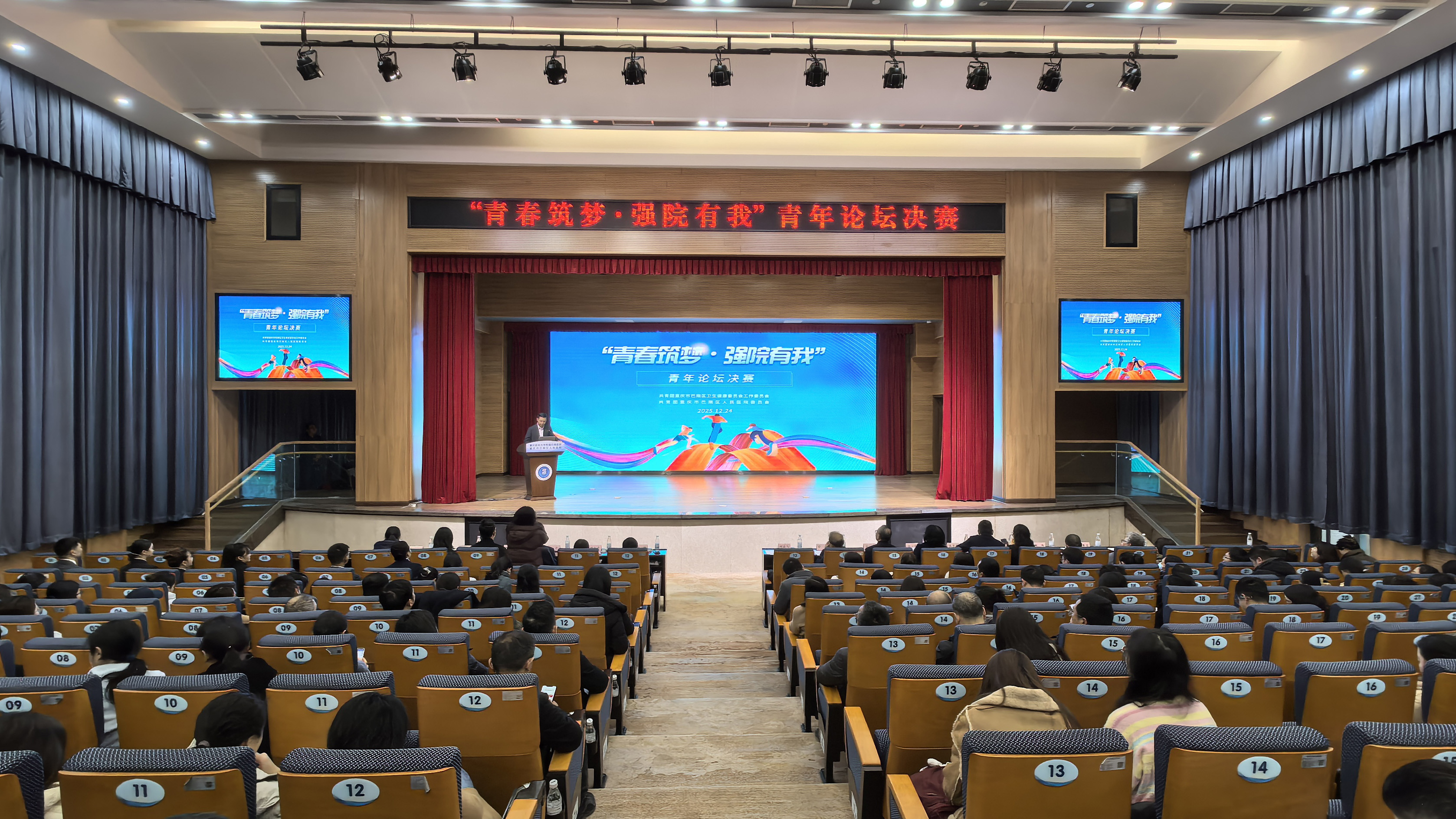 八十五载薪火相传,青春奋进正当其时。2025年12月24日下午,重庆医科大学附属巴南医院(重庆市巴南区人民医院)厚生厅内思想激荡、青春飞扬,“青春筑梦·强院有我”青年论坛决赛在此隆重举行。市卫生健康委团委副书记何云飞、区卫生健康委党委专职副书记杨健、团区委副书记赖虹霓、区卫生健康委团工委副书记赵剑锋出席本次论坛,医院全体在家班子成员、中层干部、团员青年代表及巴南区卫生健康系统各团组织负责人齐聚一堂,共同见证这场青春智慧与医院发展愿景的深度对话。