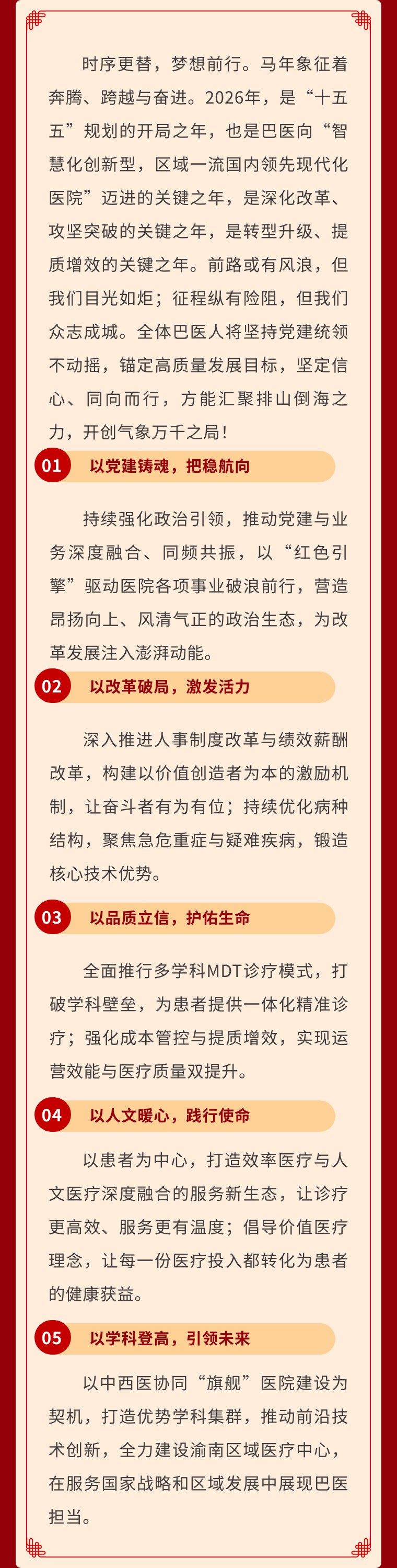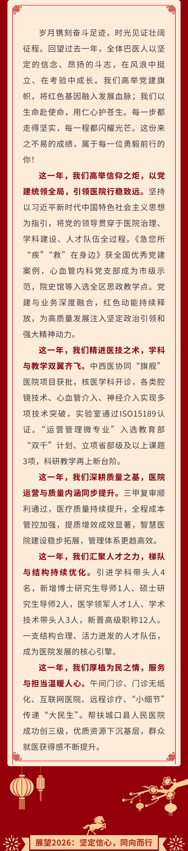 同志们,朋友们!奋楫者先,同向者胜。新征程的号角已经吹响,让我们在党建统领下,以龙马精神、昂扬斗志,坚定信心、同向而行,为健康巴南建设贡献更大力量,共同开创医院更加辉煌的明天!