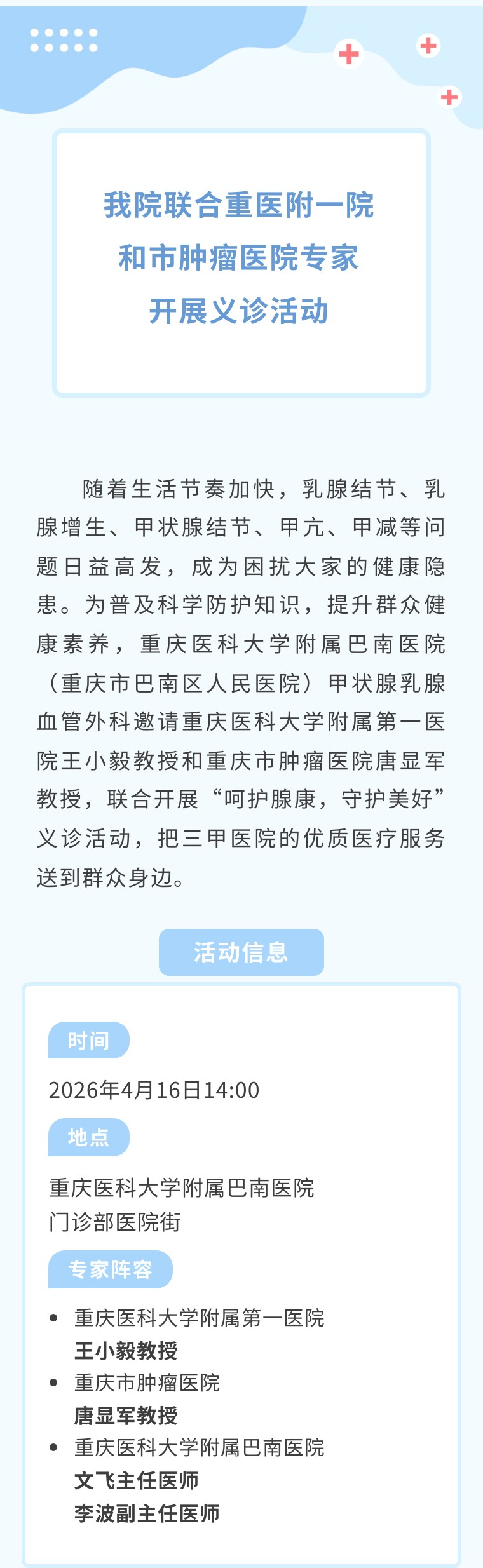 【健康“医”靠】我院联合重医附一院和市肿瘤医院专家开展“呵护腺康,守护美好”义诊活动 来源:甲状腺乳腺血管外科 发布时间:2026-04-10 18:40:57 浏览次数: 次 【字体:小 大】 分享到: 【打印正文】